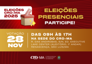 A Eleição CRO-MA 2025 será realizada nesta sexta-feira, dia 28 de novembro, das 09h às 17h, em formato PRESENCIAL apenas na sede do CRO-MA, onde serão instaladas as mesas