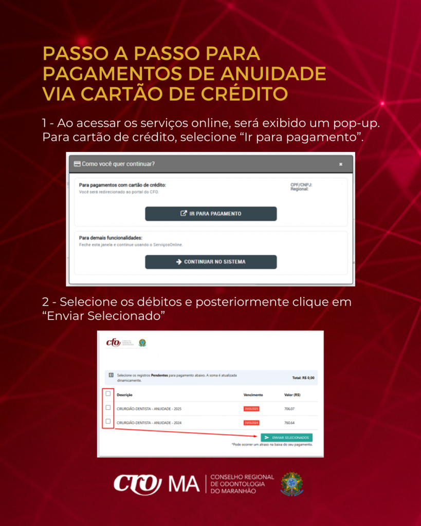 Para utilizar a nova opção de pagamento, os cirurgiões-dentistas podem acessar os Serviços Online do Sistema CFO e seguir o passo a passo abaixo: