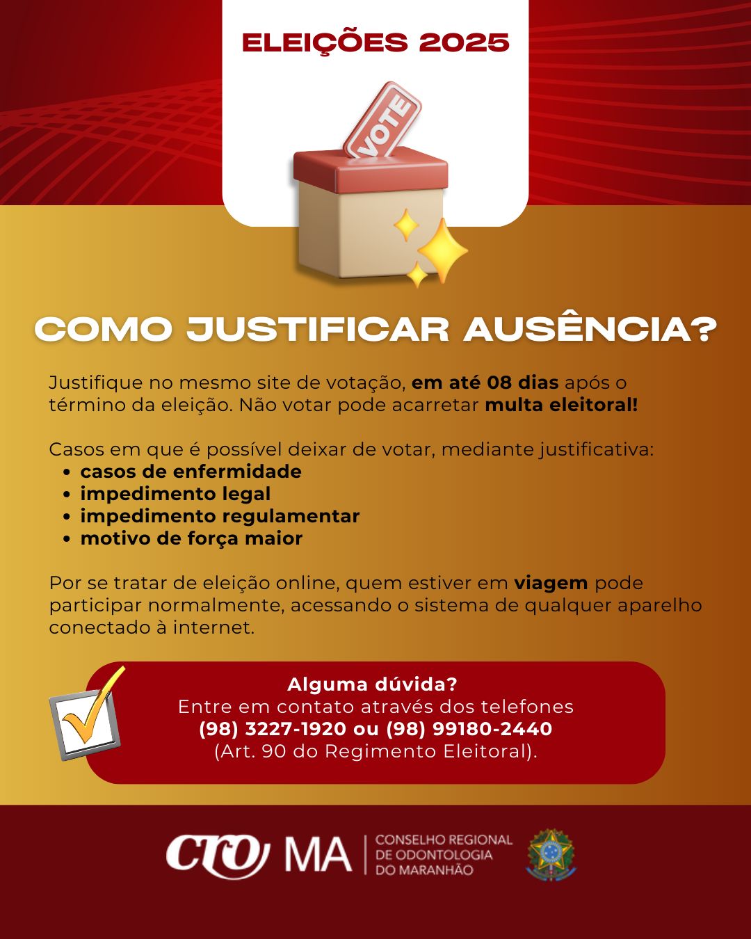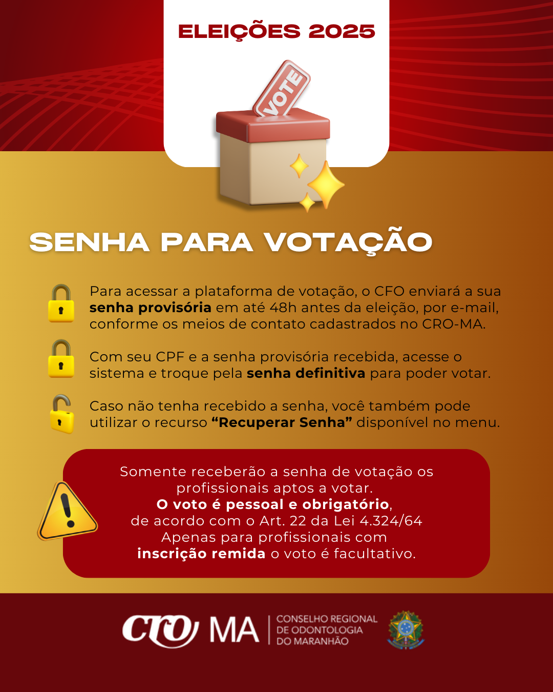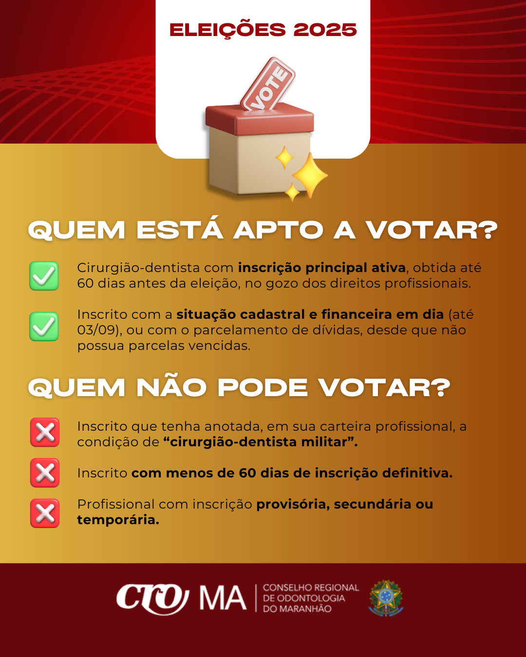 Ressaltamos que a organização e condução do processo eleitoral são de responsabilidade exclusiva do Conselho Federal de Odontologia (CFO), cabendo aos Conselhos Regionais apenas o cumprimento das determinações por ele estabelecidas.